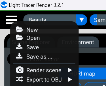 "New" option in File menu would open a simple new scene with sensible defaults. Save and Save As are split into separate actions — just like in most desktop apps.